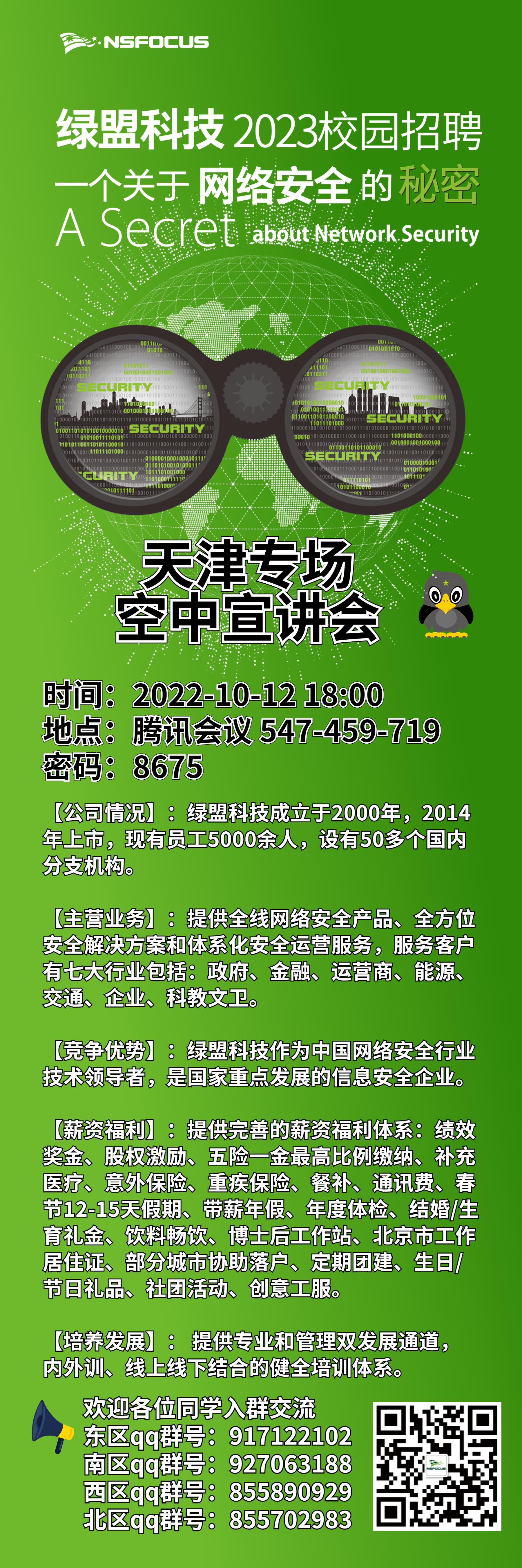 点击进入【天津站专场】绿盟科技2023届校园招聘空中宣讲会